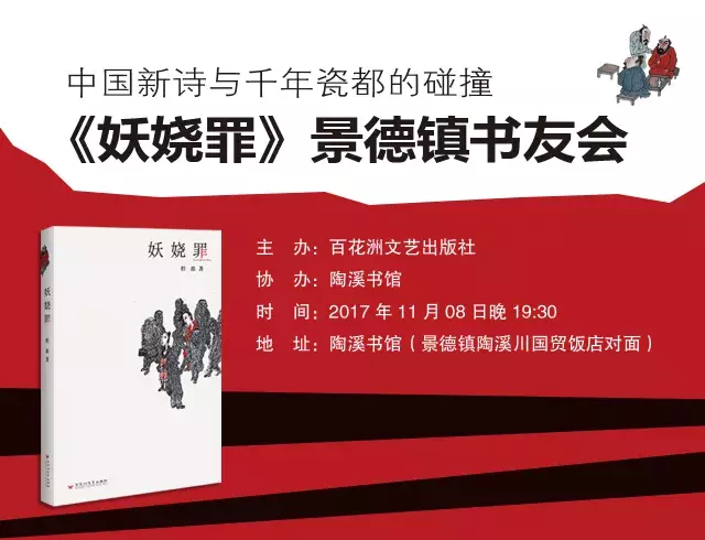 11月8日夜,瓷都景德镇陶溪川创意园陶溪书馆正在进行一场被与会者称之为“妖娆的艺术盛宴”,由百花洲文艺出版社主办的“中国新诗与千年瓷都的碰撞:《妖娆罪》景德镇书友会”如期召开。《妖娆罪》是中国当代“十佳诗人”之一、“新古典主义诗歌”代表人物程维暌违十年的新作,书中的诗作,即便精短,亦内容开阔而深邃,拥有寻常诗歌少有的细节元素与色彩斑驳的奇妙画面感,包含了诸多意味。