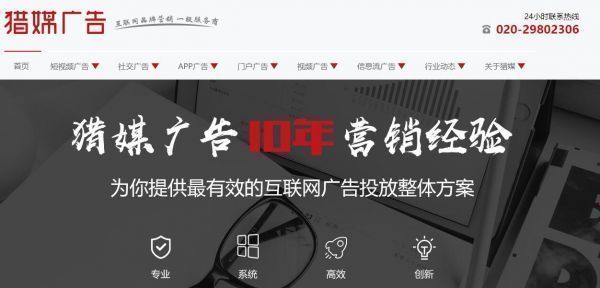 猎媒广告——互联网品牌营销服务商,专注品牌广告营销,全国引流推广。合作的广告平台有:快手广告,抖音广告,广点通,朋友圈广告,百度信息流, 360信息流,微博粉丝通,新浪扶翼,网易有道,今日头条广告,陌陌广告, 凤凰网广告,知乎广告,wifi钥匙广告,美柚广告,哔哩哔哩广告,优酷视频广告,爱奇艺视频广告等。