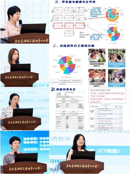 在课后的评课环节,课题组一改以往“就课论课”的研讨方式,组织老师们将自己现场观察的记录内容、即时产生的困惑问题与华师大国际课堂分析实验室即时生成的“数课”报告进行比对分析。为了让老师们能够更深入地透过课堂表层去深入解构教师的教学和学生的学习,学校课题指导专家、宁波大学教师教育学院毛玮洁博士帮助老师们深析观察量表,基于“数课”报告给予科研引领,不仅对授课教师的学习目标进行了进一步的细化,更为三个观察组小组的教师点明了观察目的和报告思路。现场,不同学科教师组成的观察小组各抒己见,现场氛围热烈真诚。