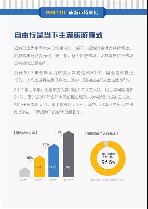 据中国旅游研究院、国家旅游局数据中心发布的第十部《中国旅游经济蓝皮书》显示,预计2017年全年,中国国内和入境旅游人数超过51亿人次,旅游总收入超过5.3万亿元,旅行已经成为大众休闲生活中不可替代的一部分。而其中,自由行人数占比97%。