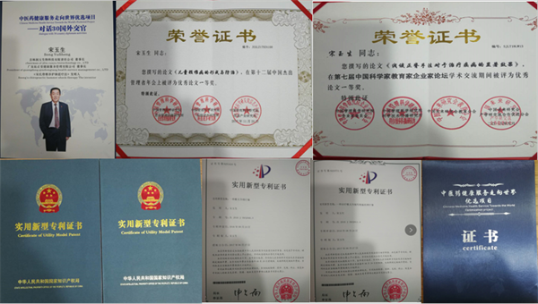2015年,撰写的论文《开启生命活力的钥匙——浅论细胞矿物能量学》,在第十届中国杰出管理者(广州)年会上获得二等奖,本人也被中国管理科学研究院学术委员会吸收为特约研究员; 2017年撰写的论文《儿童颈椎病的形成与防治》,在北京人民大会堂召开的“第十二届中国杰出管理者年会上”获得一等奖,本人被中国管理科学研究院学术委员会增补为学术委员。 2018年9月17日,在北京召开的第七届“中国科学家教育家企业家论坛上”我撰写的论文《浅谈正脊手法对于治疗疾病的显著效果》,在本届学术交流大会评为优秀论文一等奖。 并受到中央电视台网络频道记者专访。 2019年6月16日,在参加北京举行的与30个国家外交官对话的一带一路的会议上,由我发明并获得的国家专利的“宋氏锤震疗法”,被大会选定为“中医药健康服务走向世界优选项目”,并获得大会颁发的证书。