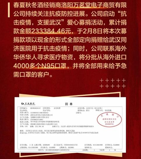 值得一提的是,山东百春酒业,洛阳万茗堂电子商务有限公司,青海八坊青稞酒酒业等等,他们的爱心捐赠,充分体现了中国人民在疫情面前精诚团结、共渡难关的责任和担当。在了解中记者得知,在抗击疫情的关键时期,洛阳万茗堂电子商务有限公司一直关注着武汉疫情动态,在确保企业和员工防护安全的同时,该公司组织职工开展募捐活动支援武汉,最终爱心行动总计募捐金额233384.46元,并火速将这笔爱心捐款全部定向捐赠给武汉同济医院用于抗击疫情。除此之外,另一家经销商青海八坊青稞酒酒业有限公司也是情系“疫”线,捐款捐物,慰问防疫一线的工作人员和一部分低保户,用企业的实际行动助力疫情防控工作,彰显企业的社会责任感。不同的方式,同样的爱心,疫情仍在持续,但大爱也在继续传递。
