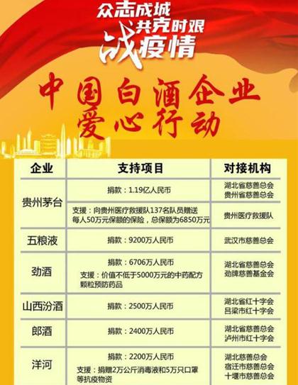 2020年伊始,突如其来的新冠肺炎疫情来势汹汹,在这个特殊的时刻,社会各界、各行业纷纷发起援助,汇聚力量,抗击疫情。这其中参与抗击疫情的中国白酒行业众志成城,火速集结人力物力财力驰援武汉,共克时艰。据不完全统计,白酒行业累计捐助超过10亿元人民币,成为捐助的主力军,为抗击疫情做出了重大贡献。