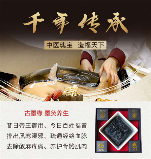 “墨御堂”是中国墨灸养生知名品牌,始建于清朝乾隆年间。墨灸养生是一个传承了数千年的中医养生瑰宝,传自唐朝的三品墨官祖敏。它是将松香烧烟成墨,配伍四十多种名贵中药,制成药墨,使用时加热软化后敷于体表,热灸人体的穴位与经络,以药入墨,墨随血走,透表达里。从而达到温经通络、扶阳固本、调理阴阳平衡的目的。