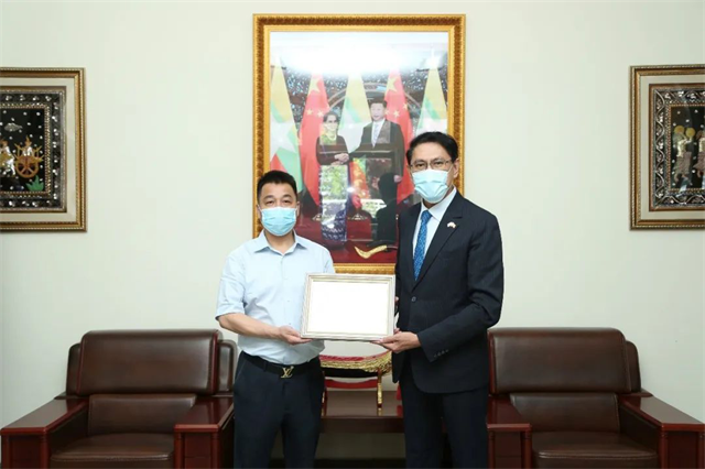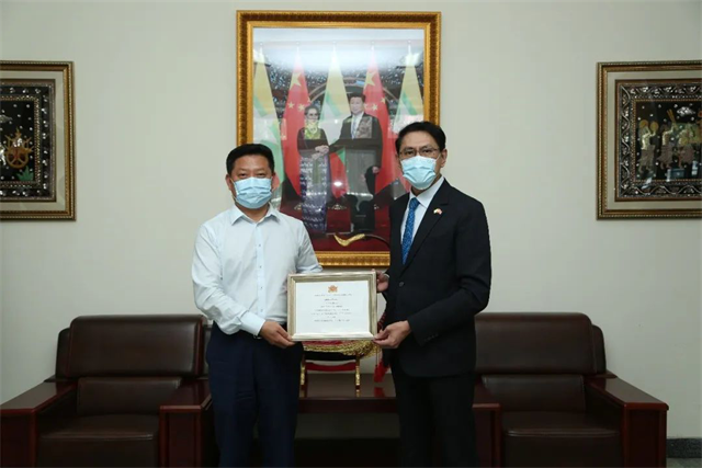 缅甸驻华大使吴苗丹佩(右)向开封市港东集团董事长陈俊延(左)颁发捐赠证书