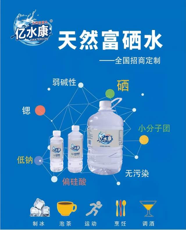 腾创未来(北京)商贸有限公司是一家主营天然富硒水的企业,其生产的“亿水康”天然富硒水具有硒、锶、锌、偏硅酸、低钠、弱碱性、小分子团、无污染于一体的完美的、更健康的饮用水的特点。