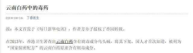2014年,丁香医生发表方舟子的文章,称云南白药有剧毒,含有超量乌头碱,毒性超过氯化钾,发生过很多起乌头碱中毒事件,然而却忽略了云南白药通过独特的炮制、生产工艺,在加工过程中,已使乌头碱类物质的毒性得以消解或减弱。