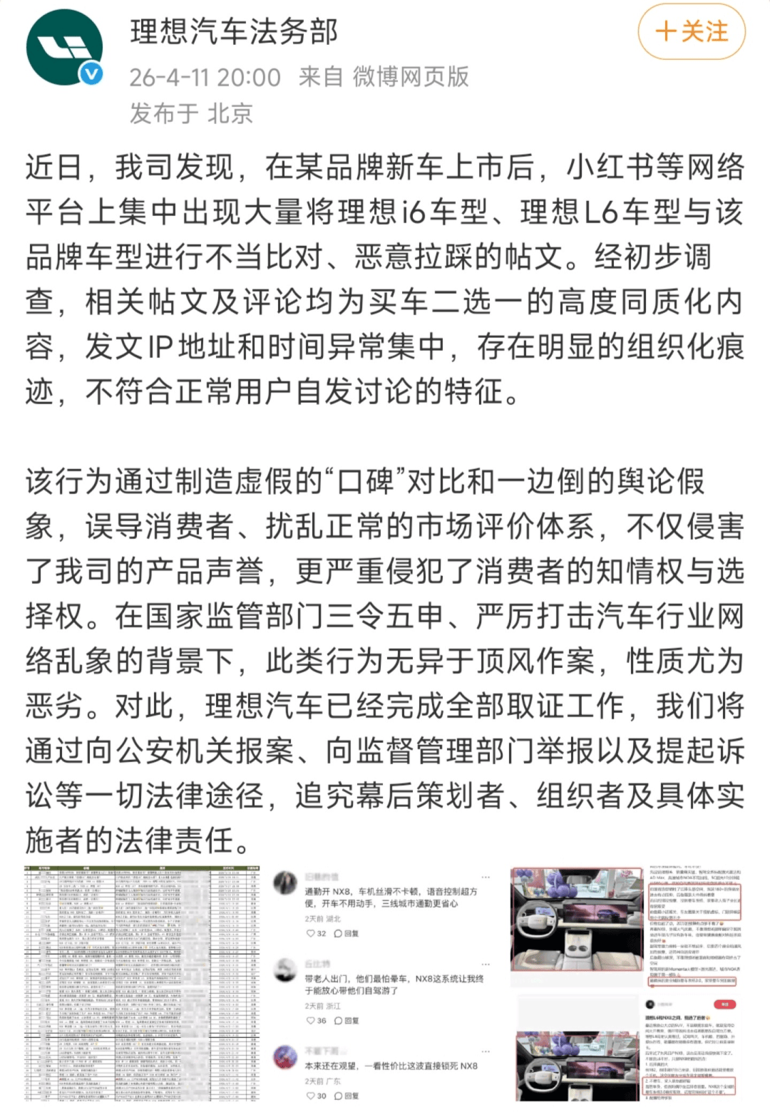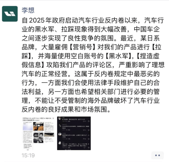 近日,理想汽车创始人李想的一则朋友圈在网络上掀起轩然大波。一句“伪军往往比鬼子更操蛋,车企也不例外”,直指某日系合资品牌雇佣营销号和水军对理想汽车进行系统性拉踩。理想汽车法务部随后发布声明称,已发现大量高度同质化的帖文和评论,发文IP地址和时间异常集中,存在明显的组织化特征。理想方面表示已完成取证,将向公安机关报案、向监管部门举报并通过法律途径追究相关责任。李想更是连发多条朋友圈,措辞强硬:“每一家都会公示,每一家都会走法律程序”。