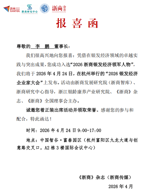 此前,爱可声助听器创始人李鹏收到来自《浙商》杂志的报喜函:凭借在银发经济领域的卓越实践与突出成果,他成功入选 “2026浙商银发经济领军人物” ,并受邀出席本次大会,与各路精英齐聚一堂,共同见证中国银发经济的高光时刻。