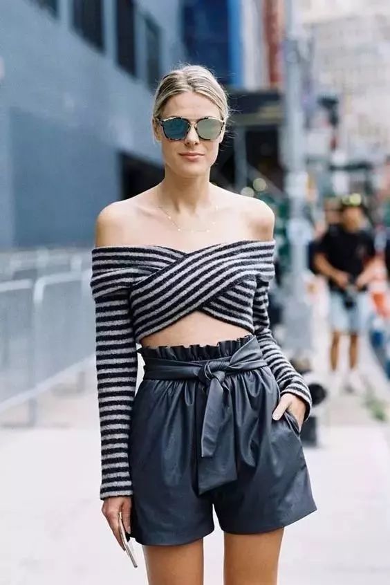 上衣的搭配还可以选短款的,露出好看的腰腹线条,适合上半身比较瘦的妹纸,只要把握好尺度的露腰效果,看起来是很时髦的,同时可以让你优雅和性感兼具。欧美风格的打造其实这样穿就有了,加上裤子的高腰设计,显瘦自然满分了,一身清凉,很适合夏季。