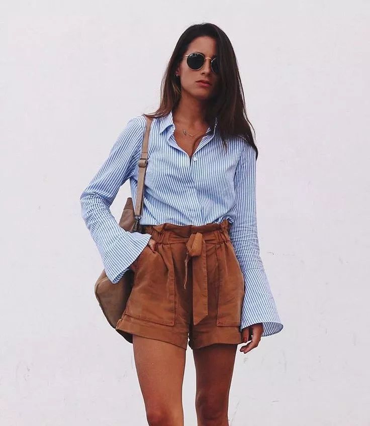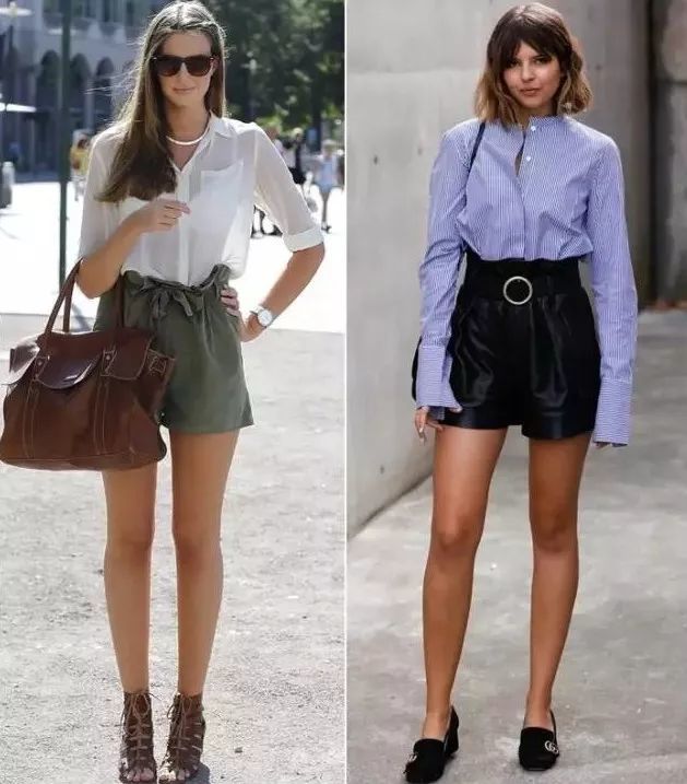 这种纸袋裤因为是高腰款,设计感也比较足了,所以上衣的搭配上尽量选择基础简单的款式就能很好的凸显裤子的设计了,V 领衬衫和纸袋短裤的搭配起来是轻熟风,作为上班装也很适合,可休闲可正式。