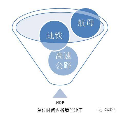 GDP的抽象理解中,GDP是单位时间内的。多年前没有建航母、修地铁,为什么?因为航母产业链假如需要1万亿,地铁产业链需要5千亿。这么大的体量,当时折腾其他产业创造的池子,装不下他们。如果那时去折腾了航母和地铁,我们哪还有时间去折腾其他。