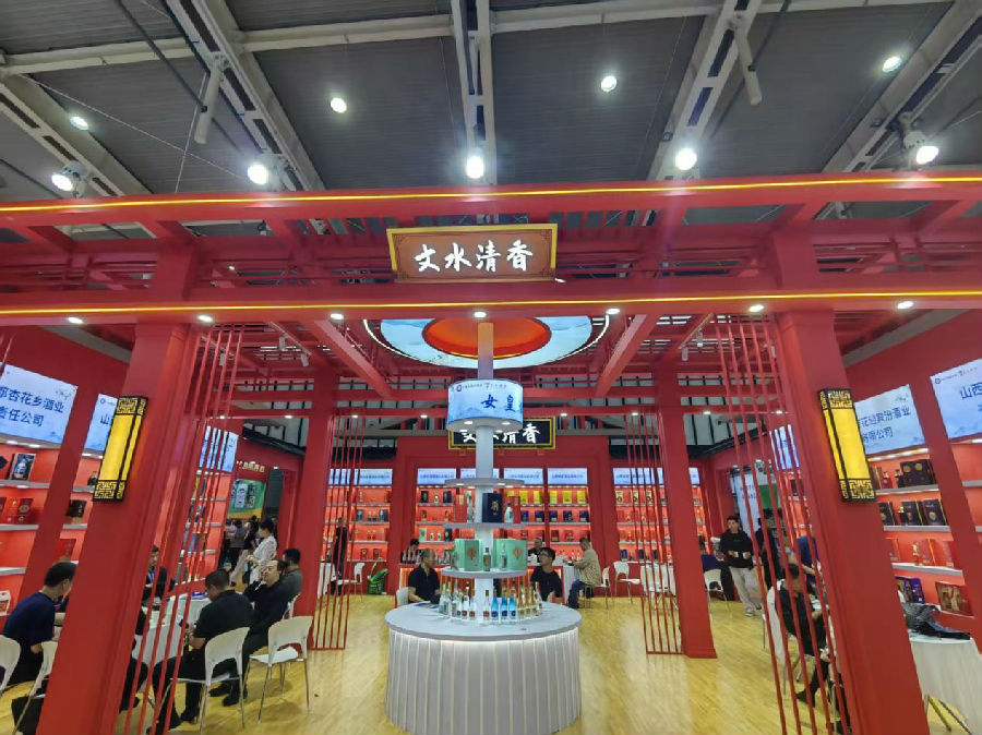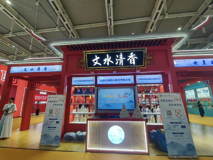 展馆内,文水清香的展位设计宛如一幅流动的晋地风情画,传统与现代交织成诗。卷轴电视上循环播放着文水县的酒企规模及酿酒工艺,让与会者可以感受到“文水清香”的硬实力,展台之上,每家系列产品整齐陈列,每一瓶酒液里,都盛满了对酿造工艺的极致坚守与不懈追求。