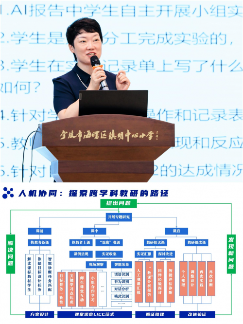 学校结合课例实践,充分阐述了将人工智能技术引入常规校本教研,逐步构建起以数据为驱动、以证据为基础的“循证教研”新范式的探索历程。这一来自一线学校的真实样本,清晰展示了在探索“从‘教学中心’向‘学习中心’转型,建构‘观察学习——收集证据-分析证据-做出新的决策’的课堂研究模式”过程中,学校、老师们对AI“数课”报告的应用是如何从表层知晓走向深入解读,校本教研的开展是如何从本学科单纯“磨课”走向跨学科共同体同伴互助的“问题解决式”主题教研的,体现了从工具认知到教学重构,再到教研生态重塑的进阶式演进。