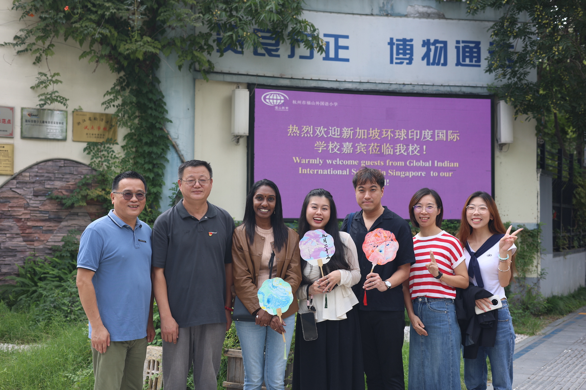这把特别的漆扇,诞生于一次温暖的相遇。2025年9月23日,新加坡环球印度国际学校的三位教师代表到杭州市福山外国语小学访问交流,与学生共同开展了一场“漆扇工作坊”。福山外国语小学的学生,带领着新加坡老师,亲手调色、浸染、晾晒,在水与墨的交融中,创作出独一无二的扇面。