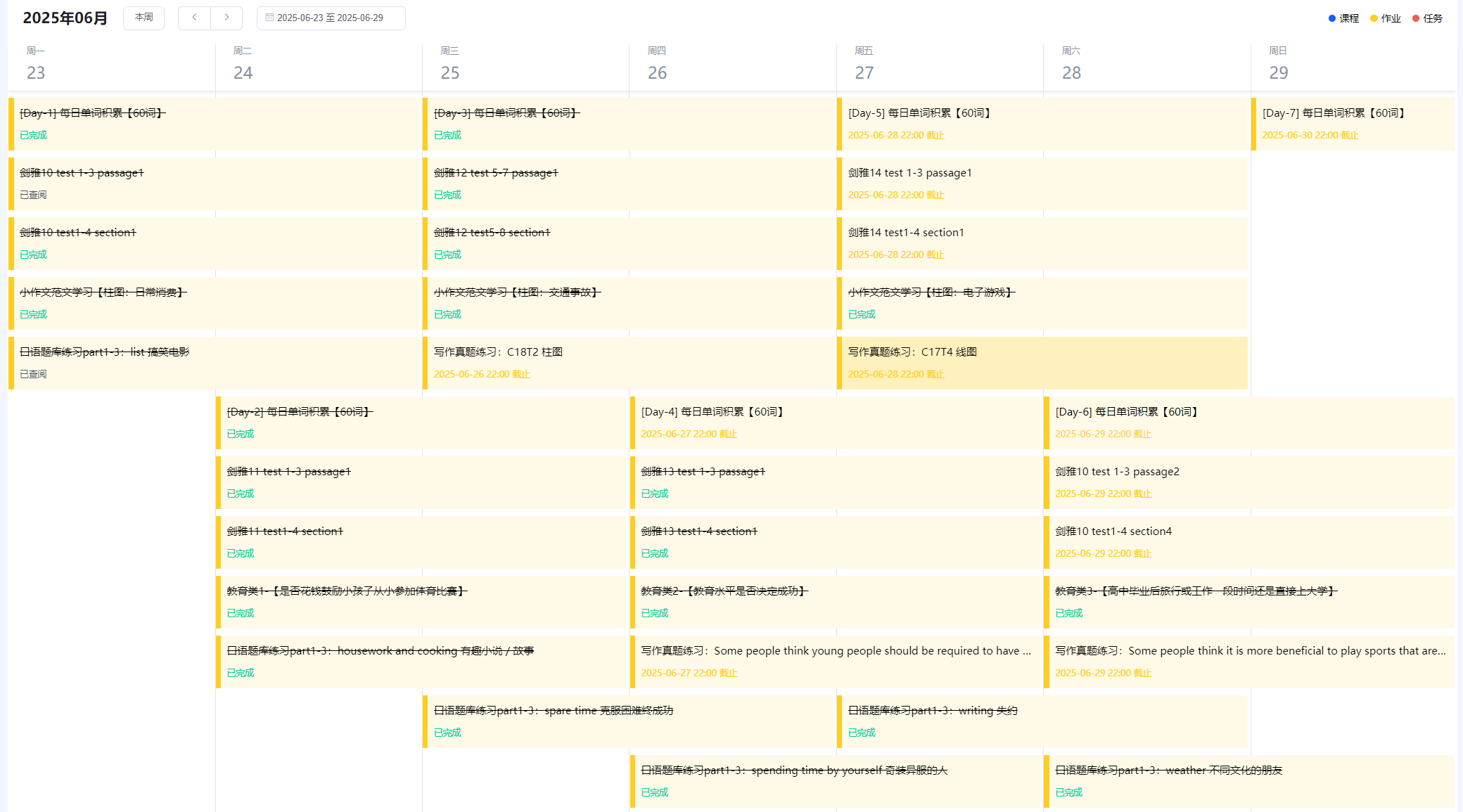 (二)学习计划制定:拒绝AI直接生成模板化的雅思托福学习计划方案,而是由专业的学习规划师根据学员的英语水平、目标成绩、备考周期、学习风格和学习习惯等,帮学员定制个人专属的个性化学习计划,详细到每天每小时,且每周按实际学习情况动态调整。系统会推送提醒每天的课程、作业、任务,一目了然,还可以回顾之前任务的完成情况,统计学习时长和作业完成率,帮学员建立稳定的备考节奏,避免盲目学习,确保各科均衡发展。