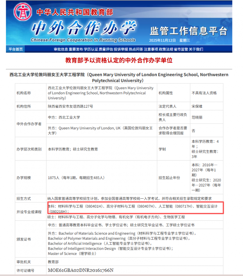 近日,西北工业大学伦敦玛丽女王大学工程学院(以下简称“学院”)增设“人工智能”(080717H)、“智能交互设计”(080218H)两个本科专业正式获得教育部批复。这是学院深入贯彻落实学校第十四次党代会精神,紧密围绕学校“127”目标和“一十百千”近中期目标,在中外合作办学领域取得的一项重要进展。新专业的成功获批,也是学校贯彻落实党的二十大关于教育、科技、人才一体化发展战略部署,积极响应《教育强国建设规划纲要(2024—2035年)》“加快建设中国特色、世界一流的大学和优势学科”战略任务的具体体现,标志着学校在深化教育对外开放、优化学科专业结构方面取得新的突破。