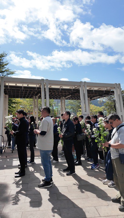 儘管前一日傍晚才結束海外賽事行程返港,歷經長途跋涉與賽事疲憊,但面對家鄉這場造成重大人員傷亡的災情,大埔足球隊第一時間敲定悼念安排。儀式現場,訓練球場與火災事發地僅一街之隔,空氣中仍縈繞着傷痛的氣息。全體職球員身着深色服裝肅立,神情凝重,在寂靜中默哀致敬,緬懷遇難同胞,向連日奮戰在救援一線的消防及救護人員致以崇高敬意。默哀完畢後,眾人手持潔白鮮花,緩步穿過馬路前往火災現場,將花束輕輕放置,以素雅芬芳寄託無盡哀思。