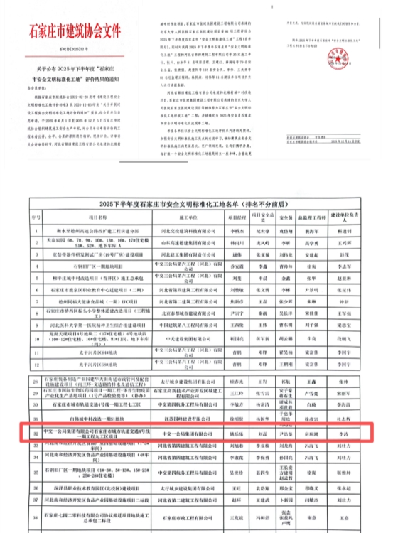 近日,中交一公局电气化公司参建的石家庄地铁4号线一期工程九工区项目成功获评2025年下半年“石家庄市安全文明标准化工地”,标志着项目在安全文明施工标准化管理方面达到行业领先水平。
