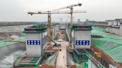 作为安徽省在建的最大规模最高等级船闸,蜀山复线船闸主体工程浇筑混凝土总量达50万立方米,相当于200个标准游泳池的体积总和。浇筑不当就会开裂,危及船闸百年寿命。为此,项目团队通过提前预埋900个传感器,实时感知混凝土内部“体温”,同时借助预埋的数万米冷却水管,在混凝土内部持续循环输水,确保温差不超过标准要求。