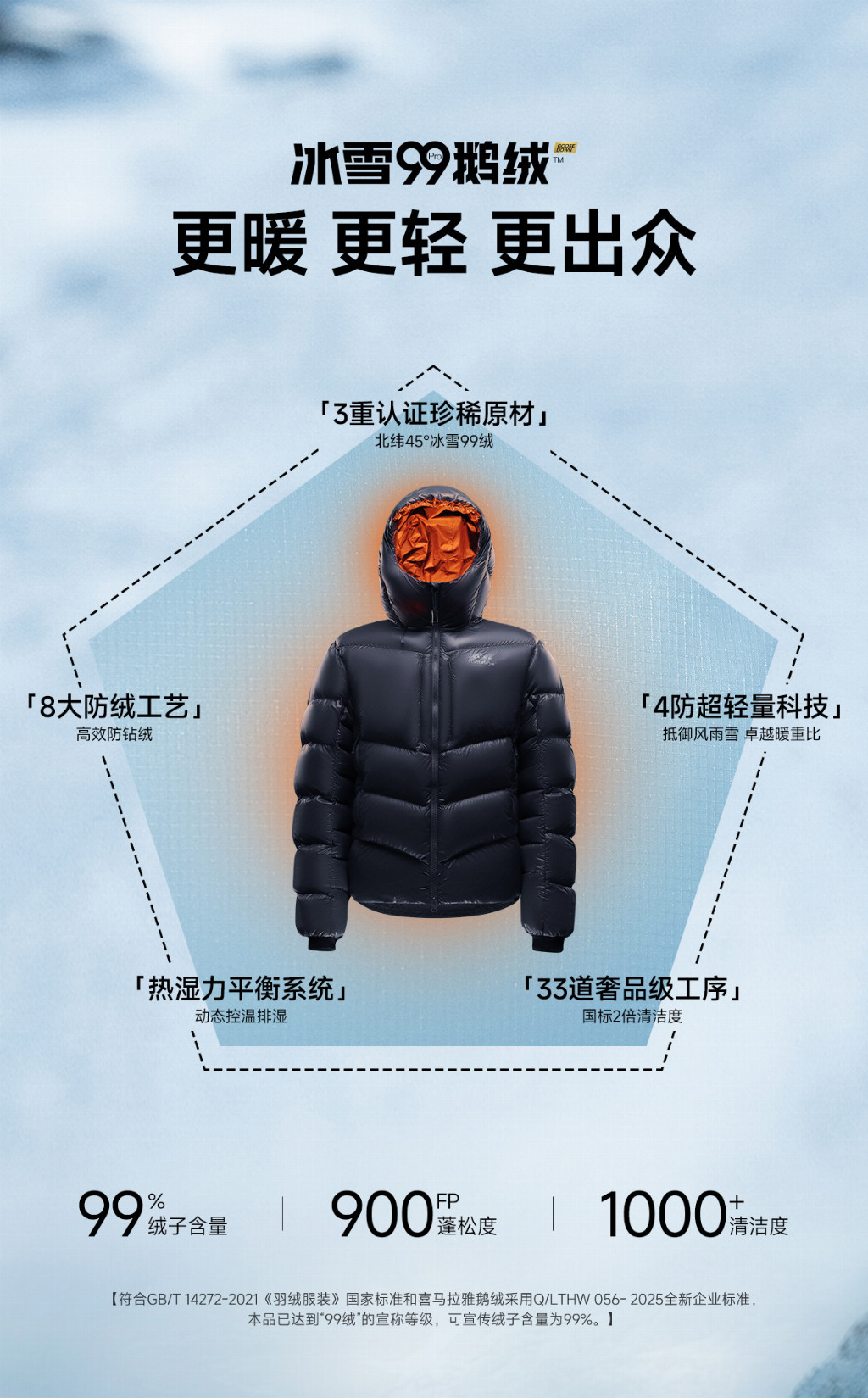 长期以来,高端户外装备市场被少数国际品牌主导。这些品牌的技术标准,成为了行业的“黄金准则"。而喜马拉雅以技术创新突破重围,其新品「冰雪99 PRO」鹅绒服的四大核心技术参数——99%高绒子含量、231g高充绒(XL码)、900FP高蓬松度、1000m+高清洁度,不仅远超行业标准,更彰显了品牌对专业性以及品质的执着追求。