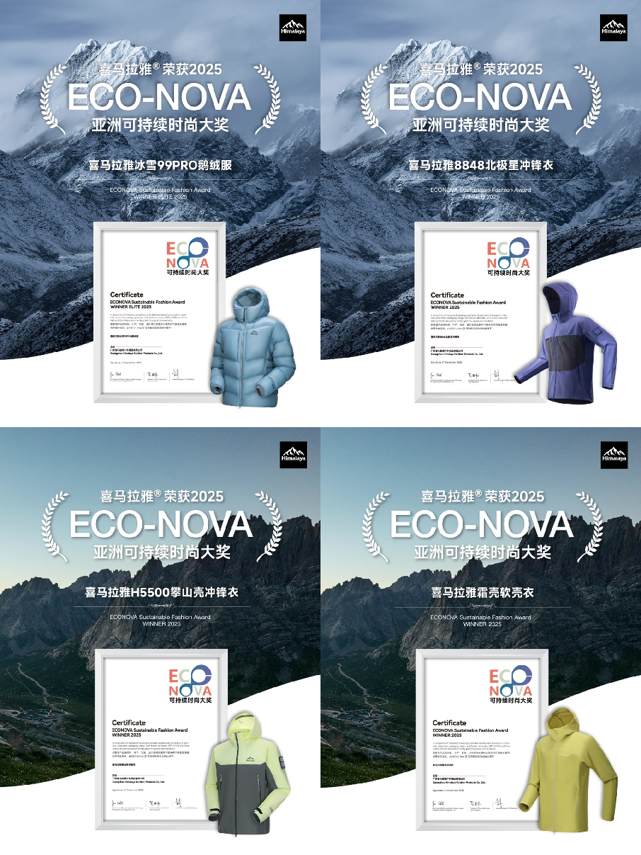 其中,喜马拉雅「冰雪99 PRO」鹅绒服,获得「ECO-NOVA Sustainable Fashion Award WINNER ELITE 2025」大奖,其以900蓬松度和99%绒子含量的高配参数,重新定义了高海拔专业户外羽绒服的性能标准。