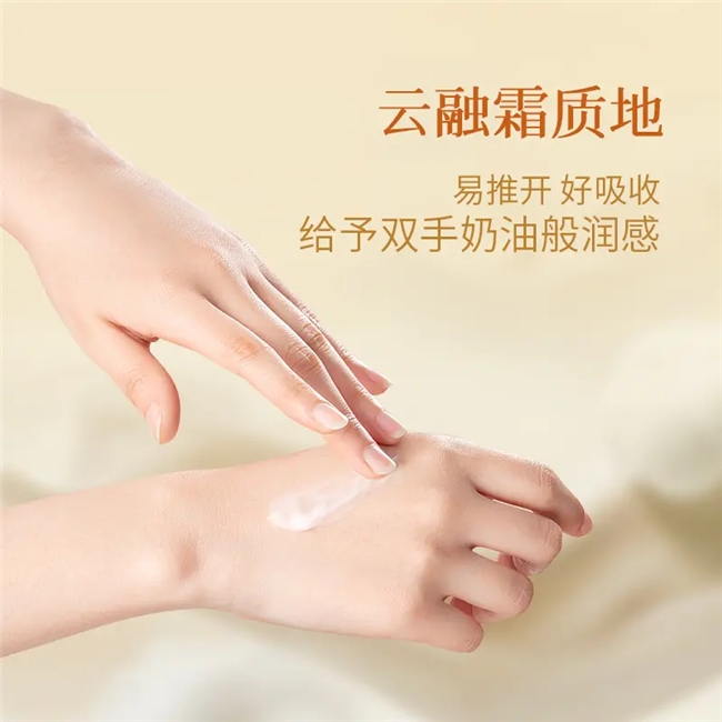 月中桂沁润护手精华霜添加了牛油果树果脂、霍霍巴籽油和野大豆油三重珍贵的植物油脂,质地如同云融霜般轻盈柔软,使用时不仅易推开、好吸收,更可以带给双手奶油般润感,温柔呵护手部皮肤。
