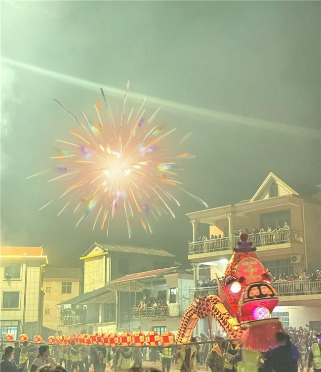 夜幕降临,华灯初上。由数百名村民共同托举的数十米“板凳龙”蜿蜒游走在辖区主要街道,龙身灯火通明,流光溢彩,所到之处人声鼎沸,数千名群众夹道喝彩,场面蔚为壮观。