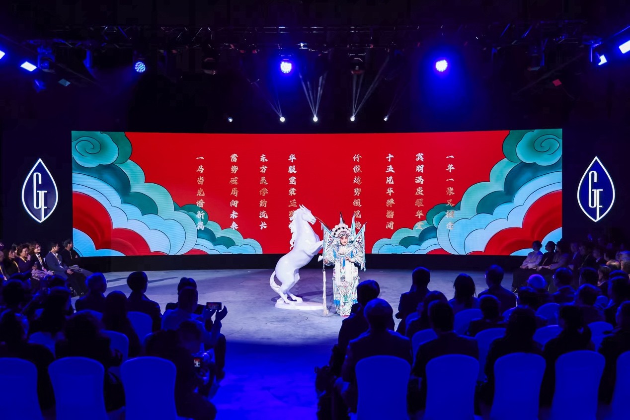 大秀启幕,京腔雅韵先声夺人。京剧新生代演员,一袭绫罗青衫头戴凤冠,恍若仙子凌波、自云端而来。行至台前,八句京腔念白字字珠玑,一念一韵,一白一境,古韵与时尚在这一刻隔空和鸣。马鞭轻扬,东方美学大幕正式拉开;光影流转间,五十套高定华服次第登场,铺展成一幅流动的东方意境画卷。