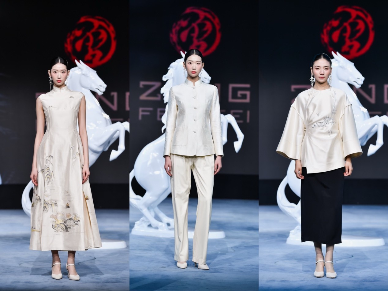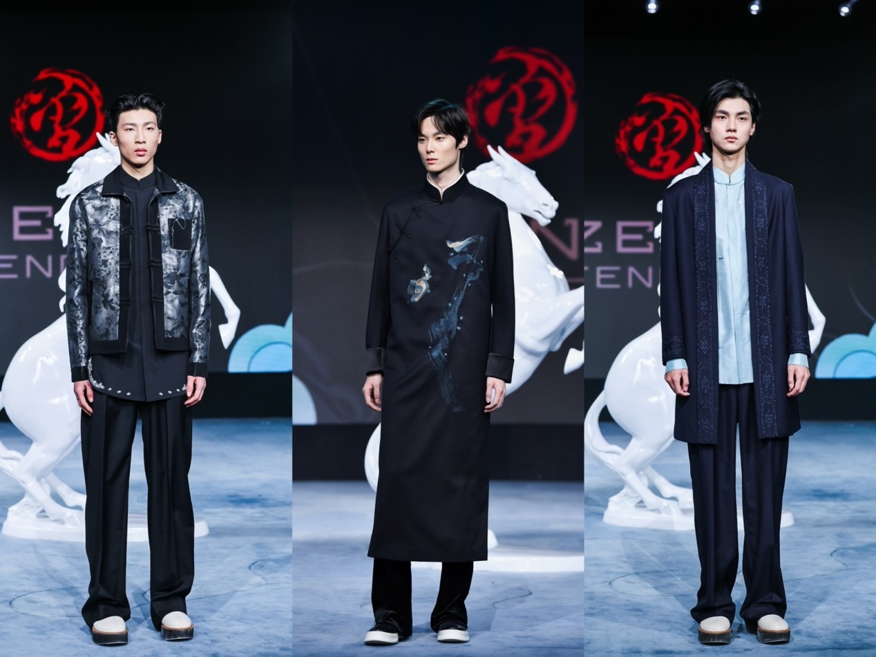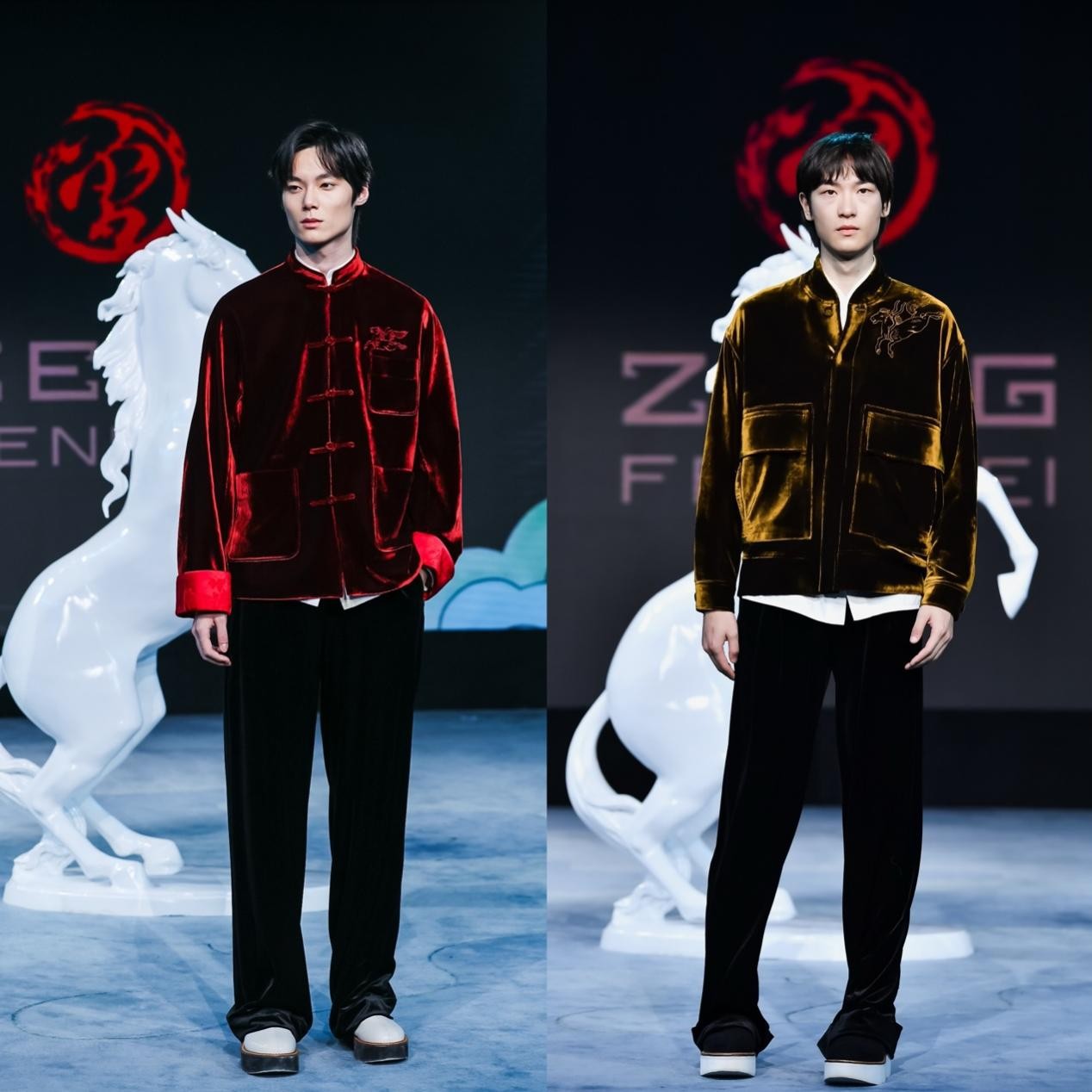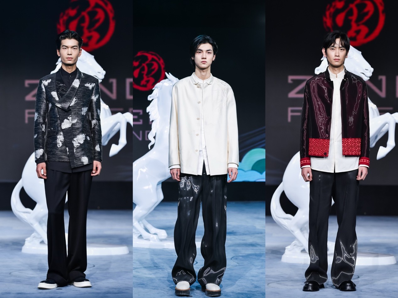 大秀开场,首套丙午系列高定男装,由曾凤飞品牌设计、定制,作品甄选桐昆丝绒面料,将丙午马年元素与立体剪裁、精工刺绣相融,尽显新中装时代风骨。同时,特邀近几季活跃在巴黎、米兰国际时装周的超模薛景伦开场演绎。设计师与超模以各自的艺术语言,完成了对中国纤维的时尚表达。