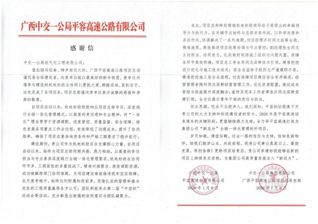 近日,中交一公局电气化公司广西平容机电项目收到来自业主单位的感谢信。信中对项目团队的担当精神、专业素养及卓越建设成效给予高度评价,为公司深耕高速公路机电建设领域、擦亮品牌口碑再添浓墨重彩的一笔。