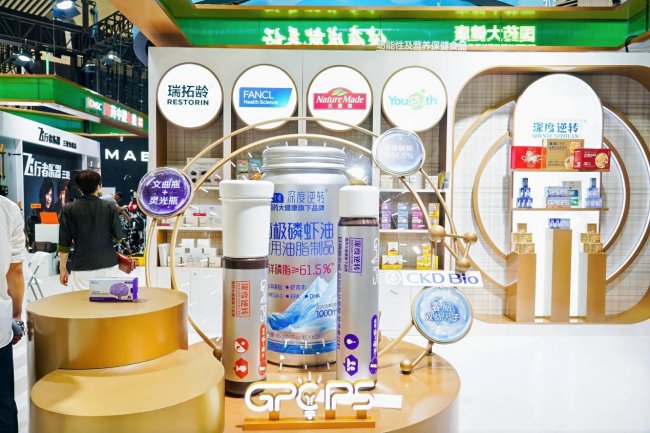 功能性及营养保健食品区汇聚国药大健康代理品牌。同时,特别设计了“深度逆转”特色互动区,三大模型(GPCPS文曲瓶、GPCPS灵光瓶、磷虾油)直观展示重磅新品。