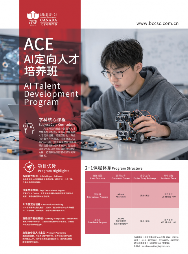 2026年4月17日,ACE国际人才定向培养项目与北京中加学校合作签约仪式在京举行,双方正式启动ACE AI定向人才班,聚焦人工智能领域高端人才定向培养,搭建国际化专业化留学升学通道,为有志深耕AI领域的青年学子提供高质量教育解决方案。