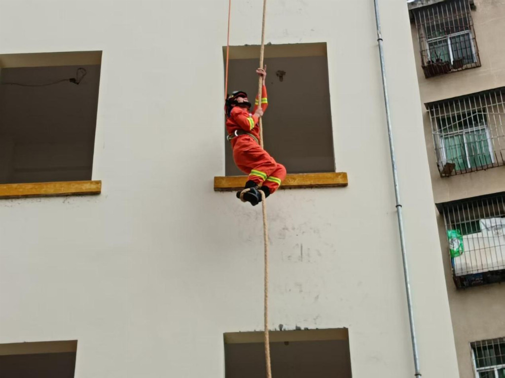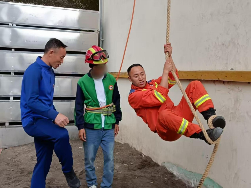 随后,大家移步到训练塔前,消防员为同学们展示了四楼绳索攀爬。只见消防员身姿矫健,双手紧握绳索,脚盘绳索,转眼间便从一楼攀至四楼。同学们纷纷鼓掌惊呼:“太厉害了!”消防员还热情邀请同学们亲身体验。在为他们仔细穿戴好安全保护设备后,消防员耐心讲解动作要领,手把手指导。几名勇敢的男生尝试了攀爬,虽然速度远不及消防员,但每个人都全力以赴,真正体会到了消防员日常训练的不易。