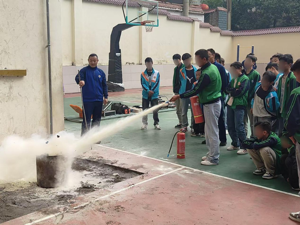 为了让同学们掌握实用的消防技能,消防员还现场演示了灭火器的正确使用方法——“一提、二拔、三握、四压”。在确保安全的前提下,消防员点燃铁桶中的报纸,火苗窜起。同学们依次上前,手持灭火器,对准火焰根部喷射,迅速将火扑灭。大家踊跃参与,现场气氛紧张而热烈。通过亲身操作,孩子们不仅学会了灭火技巧,更对消防员这份职业多了一份由衷的敬畏。
