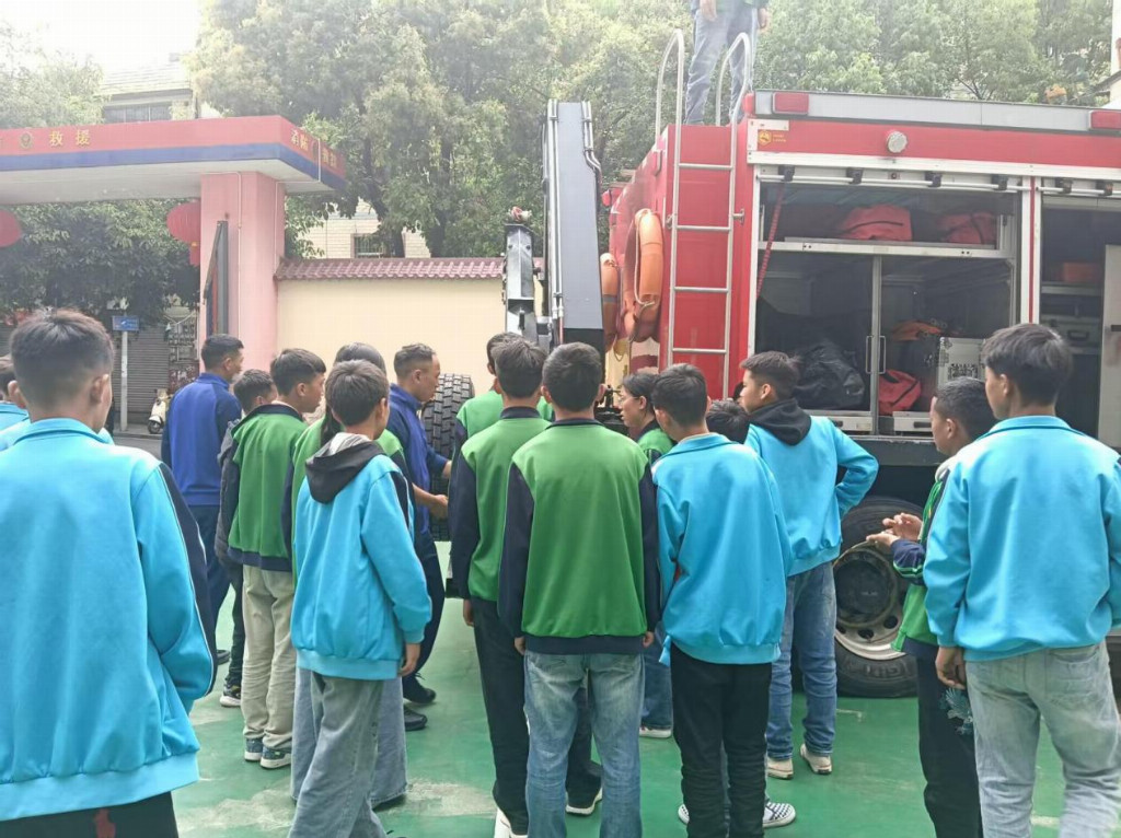紧接着,消防员又逐一介绍了常用的消防装备,包括侦检通讯设备、液压机动泵、切割锯等。同学们紧随消防员的步伐,认真聆听,面对这些平时难得一见的专业工具,大家眼中满是好奇与敬佩。