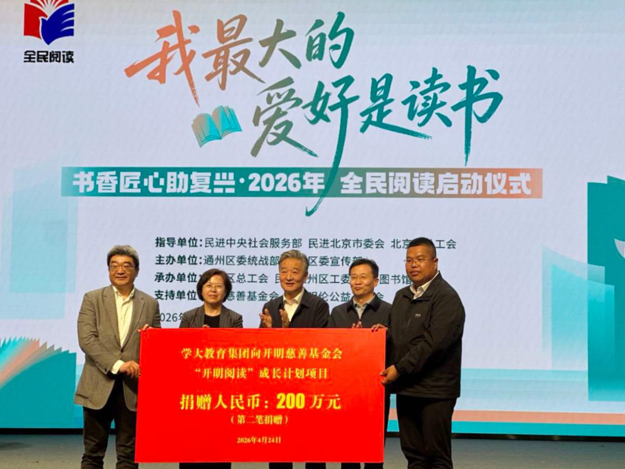4月24日,“我最大的爱好是读书——书香匠心助复兴·2026年全民阅读启动仪式”在北京城市图书馆举行。活动现场,民进中央第十五届企业家联谊会副会长、开明慈善基金会副理事长、学大教育创始人、董事长兼CEO金鑫代表学大教育集团,通过开明慈善基金会向“开明阅读成长计划”捐赠第二笔200万元善款,以实际行动支持全民阅读事业,助力书香社会建设。
