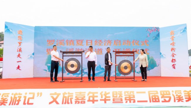 “当——”清脆激昂的铜锣声划破溪畔宁静,罗溪镇夏日经济启动仪式暨溪游漫道开道仪式正式拉开帷幕。泉州市洛江区委常委、宣传部部长张荣伟,洛江区政府副区长王泽勇,市文化广电和旅游局资源开发科科长马宁,罗溪镇人民政府镇长许奕智共同敲响铜锣,向外界发出“赴罗溪之约、赏山水之美、品侨乡之韵”的诚挚邀约。