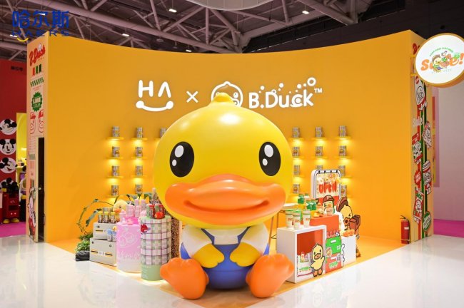 “连续三年全球杯壶销售额第一”*的哈尔斯,今年以全新姿态再度登场。展区以“年轻、时尚”为基调,延续“巨型礼盒”创意概念,主打黄色与蓝色的明快撞色,采用开放式布局,将“时刻陪伴,自有温度”的品牌理念融入空间动线,打造了“钛专区、哈哈鸭专区、鸿蒙智选专区、新华社文创专区”四大主题场景。哈尔斯、NONOO及哈哈鸭等系列品牌矩阵集体亮相,以场景化陈列演绎从品质饮水到情绪共鸣的“陪伴每一度”生活美学,用科技硬实力与文化软实力的双重奏,生动诠释了“保温杯就用哈尔斯”的消费共识,成为开展首日的人气焦点。