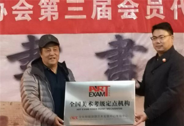 本届书画展开幕式上,中国书画报北京双拥艺术中心主任苗鹏,还举行了文旅部美术考级机构授牌仪式,北京聚贤庄文化交流中心主任张绍平接受了铜牌。